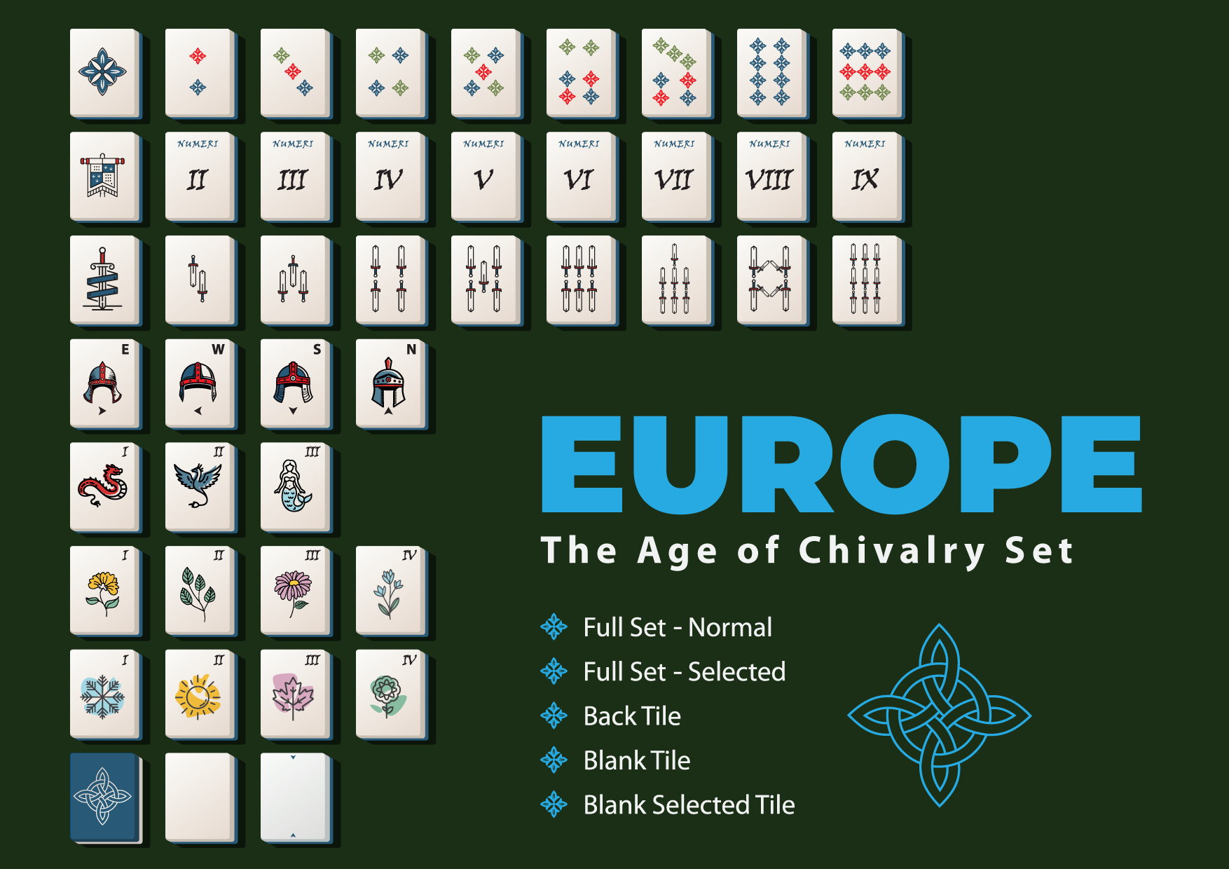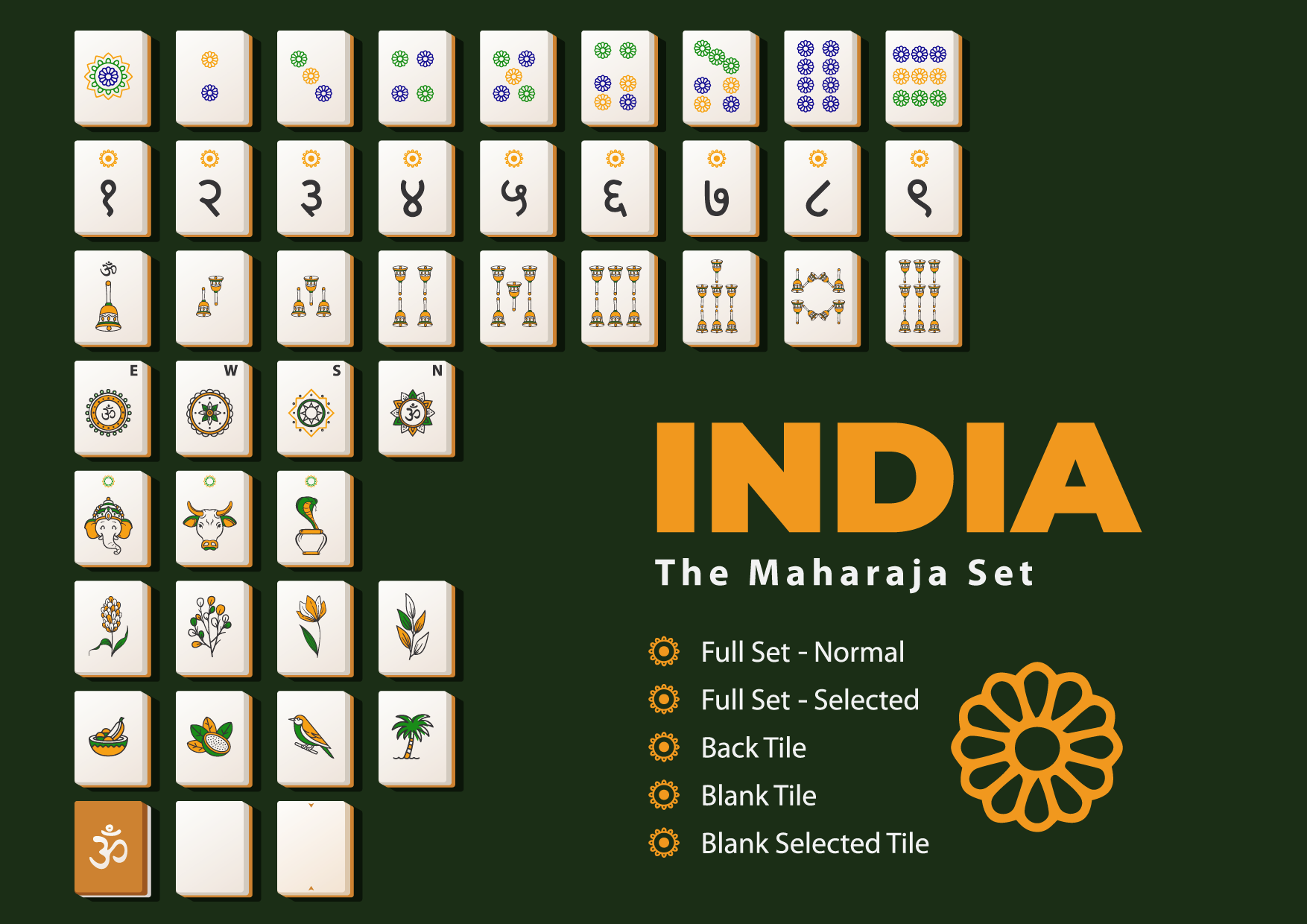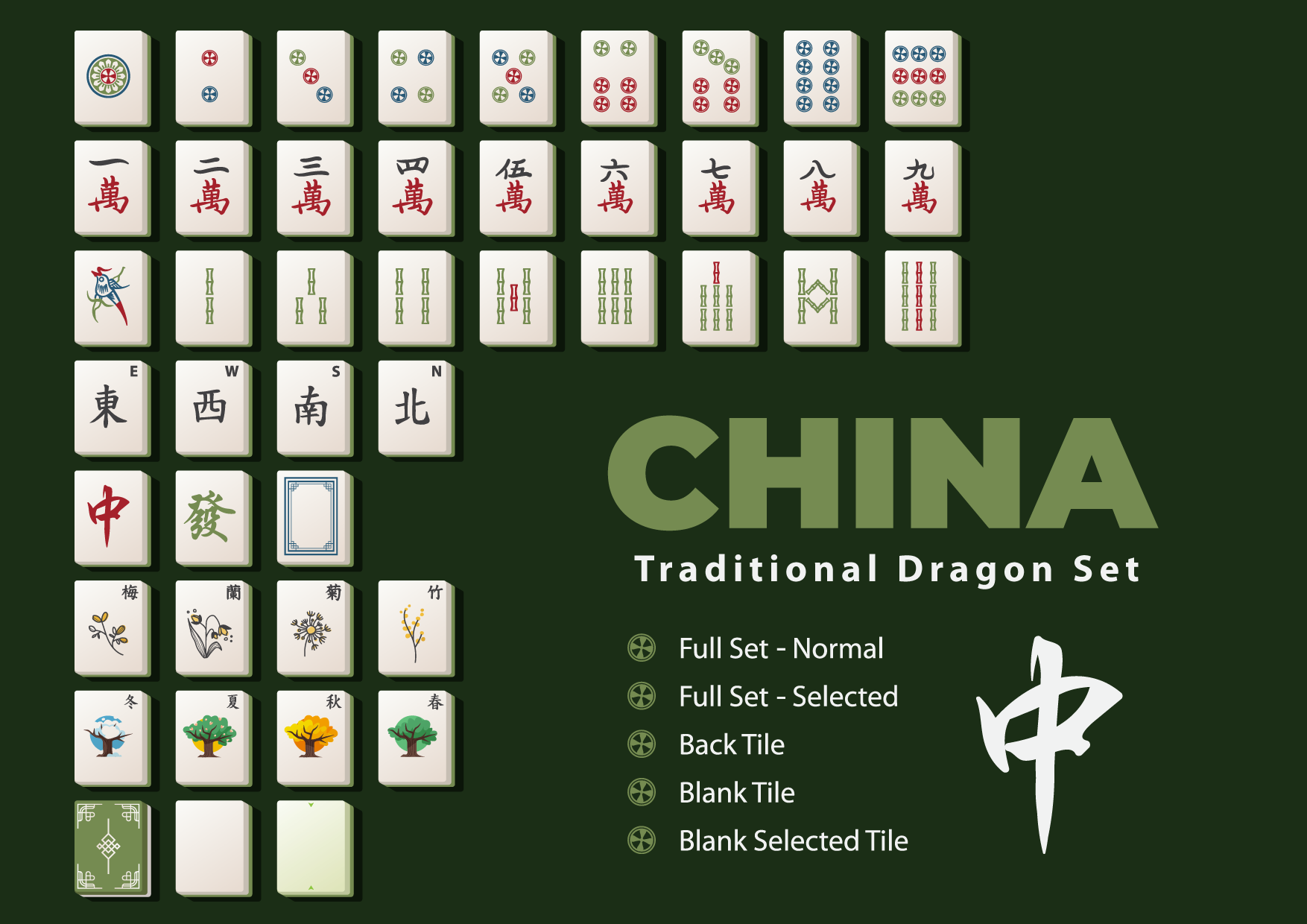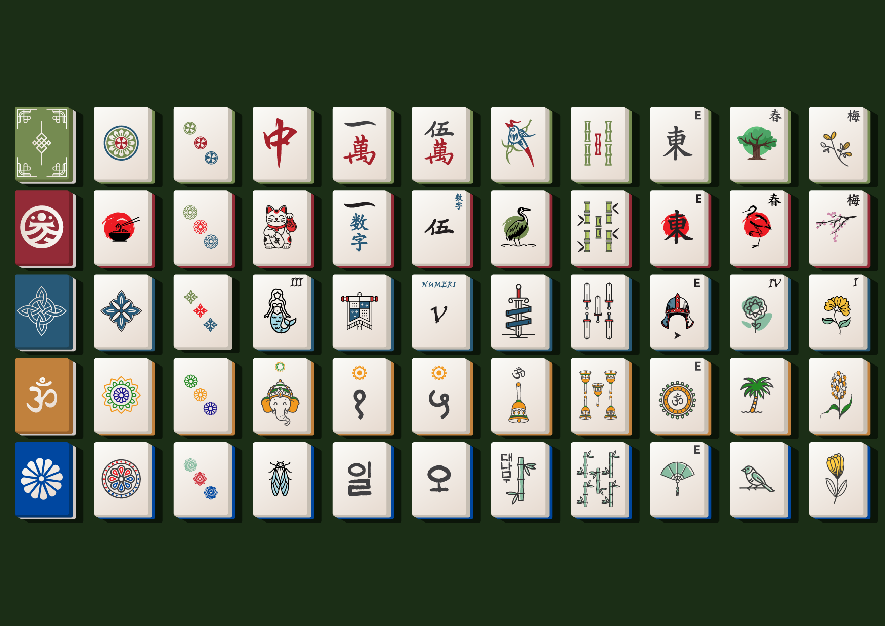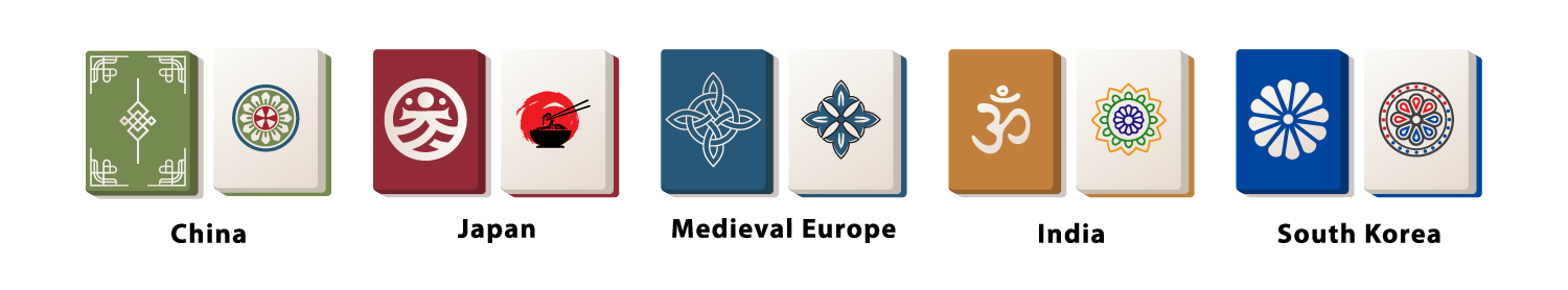 This asset pack contains 5 different complete Mahjong tile sets. Assets come as .png files with transparent background, each tile being 150px x 188px, as well as vector (scalable and editable files) depending on your package.